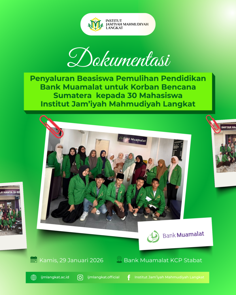 STABAT – Kabar bahagia menyelimuti civitas akademika Institut Jam’iyah Mahmudiyah (IJM) Langkat. Sebanyak 30 mahasiswa terpilih secara resmi menerima Beasiswa Pemulihan Pendidikan dari Bank Muamalat sebagai bentuk kepedulian terhadap para penyintas bencana di wilayah Sumatera. Prosesi penyerahan bantuan ini berlangsung khidmat pada Kamis, 29 Januari 2026, bertempat di Kantor Cabang Pembantu (KCP) Bank Muamalat Stabat. Kehadiran program ini menjadi angin segar sekaligus suntikan semangat bagi para mahasiswa agar tetap fokus meraih mimpi meski baru saja melewati masa sulit.